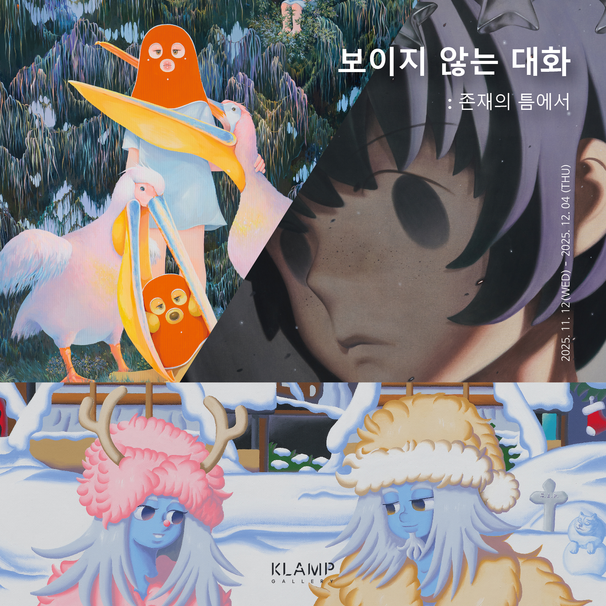 <전시 안내>25년 11월 12일 - 12월 04일AM 11 - PM 6*매주 월, 화요일 휴관입니다.*무료 관람입니다.[ 찾아오시는 곳 ]서울 강남구 양재천로 191/ 동화빌딩 1F*주변 공영주차장 이용부탁드립니다. 보이지 않는 대화: 존재의 틈에서(김용오, 전예진 ,현오) 끊임없이 변하는 세상 속에서 인간은 여전히 스스로에게 묻는다.“나는 누구이며, 어떻게 살아가고 있는가.” 우리는 서로를 바라보지만, 진정한 대화는 눈에 보 이지 않는 곳에서 일어난다.감정, 기억, 관계, 시간은 형태를 가지지 않지만, 그 안에서 우리는 서로에게 말을 걸고 응답 하며, 타인의 존재를 통해 다시금 자신을 확인한다.《보이지 않는 대화: 존재의 틈에서》는 김용오, 전예진, 현오 3명의 작가가 각자의 시선으로 이 시대를 살아가는 인간의 내면과 사회적 관계, 즉 자기 자신과 맺는 대화의 방식을 탐색한 다. 이들의 작업은 언뜻 서로 다른 차원에 존재하는 듯하지만, 결국 하나의 질문으로 수렴된 다. 그리고 시간의 흐름 속에서 보이지 않지만 분명히 존재하는 ‘대화의 순간들’을 탐구하는 전시이다.이 전시는 완결된 해답을 제시하지 않는다. 대신 서로 다른 세계가 부딪히고 스며드는 틈에서 인간의 존재가 어떻게 흔들리고 이어지는지를 보여준다. 그 틈은 침묵과 응시가 교차하는 자 리이며, 보이지 않는 감정의 언어가 태어나는 공간이다. 우리는 언어를 넘어선 감정의 파장을 감지하고, 그 흔들림 속에서 자신과 타인을 잇는 연결의 감각을 경험한다. 김용오 가족결혼 사진. 2025. 162.2 x 130.3cm. acrylic on canvas김용오 Snow Family. 2024. 100 x 72.7cm.acrylic on canvas 김용오 | 관계의 거리에서 이어지는 대화김용오는 팬데믹 이후 변화한 관계의 구조와 가족이라는 개념의 재편을 주목한다.그의 작업 속 ‘가족사진’은 단순한 추억의 기록이 아니라, 끊임없이 해체되고 재구성되는 관계 의 초상이다. 그는 ‘여행’이라는 은유를 통해 관계의 변화를 이야기한다.여행의 끝에서 마주하는 낯섦과 불편함은, 익숙했던 삶이 변모하는 순간의 감정이다.김용오는 그 불안과 거리감 속에서 새로운 형태의 인간관계를 탐구한다.서로 다른 시공간에 놓인 이들이 사진, 이미지, 기억을 매개로 다시 연결되는 과정은곧 보이지 않는 대화의 또 다른 형태이다. 그의 작업은 단절과 회복, 기억과 망각이 교차하는 현대적 관계의 초상을 보여준다. 여행의 끝은 새로운 출발의 지점이며, 그 순간 우리는 서로 에게 다시 말을 건다. Artist 김용오(b.1986) Education2012 경기대학교 애니메이션 학사 졸업Solo Exhibition2025 가족사진 - 루안앤코 서울숲2023 AMERICA del sur - 아르떼케이, 서울2022 Meta Nomad - Iham Gallery, 파리2021 Wanderlust - Gallery by the harbour , 홍콩2020 World - 갤러리 스탠, 서울2016 City life - 에브리데이몬데이, 서울2015 Travel over life - 에브리데이몬데이, 서울Group Exhibition2022 Vanguard,아뜰리에아키,서울2021 Brave New world,띠오갤러리,서울2018 Grand BudapestHotel기획전,롯데갤러리,서울 외2015 White Monsters,에브리데이몬데이,서울2014 Bon Voyage,롯데갤러리,서울2013 Happy Window,아트센터 나비,서울Etc.2024 Shake shack 도곡 아트워크2022 GranTurismoAsiaCup2022 -ToyotaGazooRacingArtwork2021 NCT 2021YearDreamAnimation2020 RogervivierCovid19캠페인 아트워크 전예진 펠리컨의 습격 01. 2025. 145.5x112.1cm. Acrylic and oil pastel on canvas. 전예진 A floating path on the water. 2025. 72.7x60.6 cm. Acrylic and oil pastel on canvas전예진 | 어둠 속의 대화, 빛을 향한 응시전예진은 죽음과 꿈, 그리고 유한한 시간의 감각에서 출발한다.그녀의 ‘뒤틀어진 세계’ 시리즈는 현실로부터 멀어진 내면의 풍경이며, 복면을 쓴 인간과 동물 의 형상들은 이름도 성별도 없이 어딘가로부터 조난된 존재처럼 떠돈다.그들은 현실의 틀을 벗어나지만, 동시에 그 자유 속에서 깊은 고립을 경험한다.이 익명의 존재들은 현실의 인간이 느끼는 불안과 두려움을 대변하면서도, 결국에는 “Follow the light — 빛을 따라가라”는 속삭임을 전한다. 전예진의 작업에서 어둠은 단순히 부정적인 공간이 아니라, 내면의 빛을 발견하기 위한 통로이다.전예진의 회화는 죽음과 어둠을 회피하지 않고 마주함으로써, 오히려 인간이 얼마나 빛을 향한 존재인지를 드러낸다. 전예진은 그 어둠 속에서 일어나는 자기와의 대화, 즉 존재의 가장 근원적인 언어를 그려낸다. Artist 전예진(b.1988) Education2012 B.F.A. Painting, College of Art, HongikSolo Exhibiton2025.05 빛을 따라가 (프린트베이커리 더현대 서울)2024.08 A midsummer dream (Klamp gallery, 서울)2023.08 Dreamy Wander (Klamp gallery, 서울)2022.12 Nomad (M contemporary, 밀락더마켓 부산)2021.08 Blink (카이스트 경영대학 Research & Art gallery, 서울)2019.09 KB청춘마루 아티스타 개인전 Eternal Moments (KB청춘마루, 서울)2017.08 Tropical mood (쇼파르뮤직 Cafe Shofar, 서울)Group Exhibiton2025.05 Art & Seoul (Tokyo Park Gallery, London, UK)2025.02 Inner Landscape (333 Gallery, Taipei, Taiwan)2024.02 Moment (빌라쥬 드 아난티 컬처클럽, 부산)2023.12 ASSEMBLE group show (M Contemporary Bangkok)2023.05 Online show (Guy Hepner Editions, New York)2023.05 성수고요수목원 (Collast, 서울)2023.03 Spring group show (VINS Gallery, Taipei, Taiwan)현오 탈피. 2025.130 x 194.3cm. Acrylic on canvas. 현오 눈사람. 2024. 100 x 80.3cm. Acryli